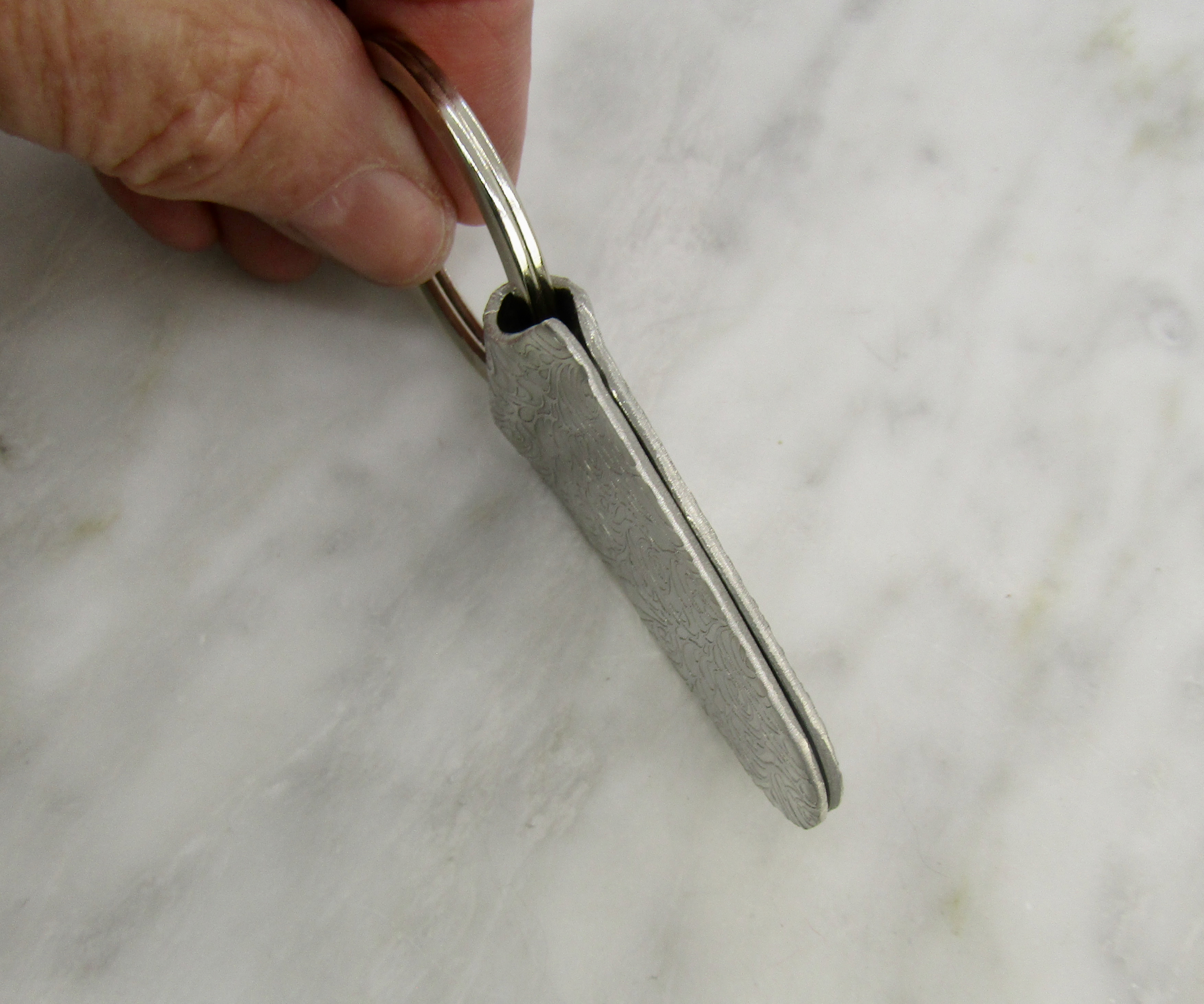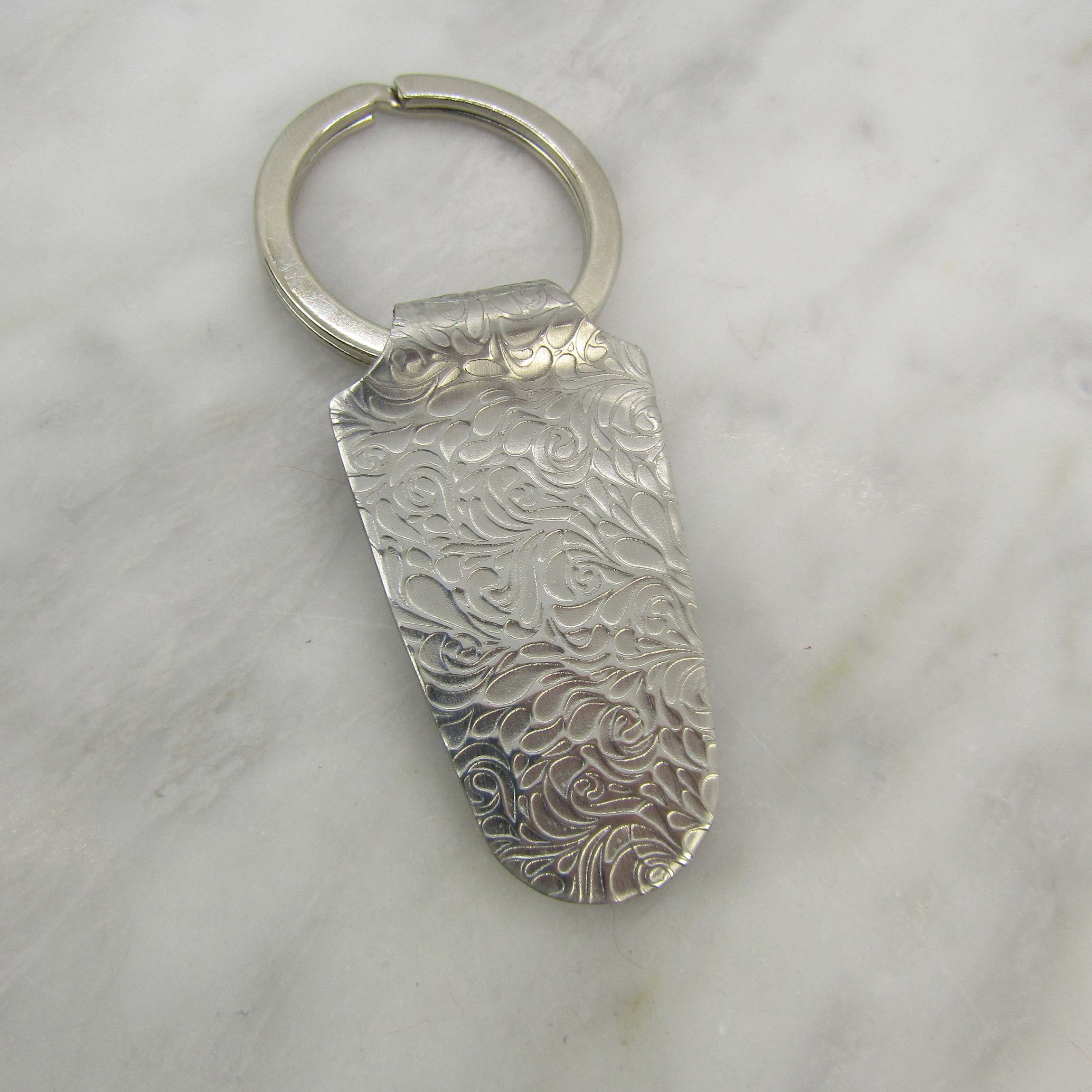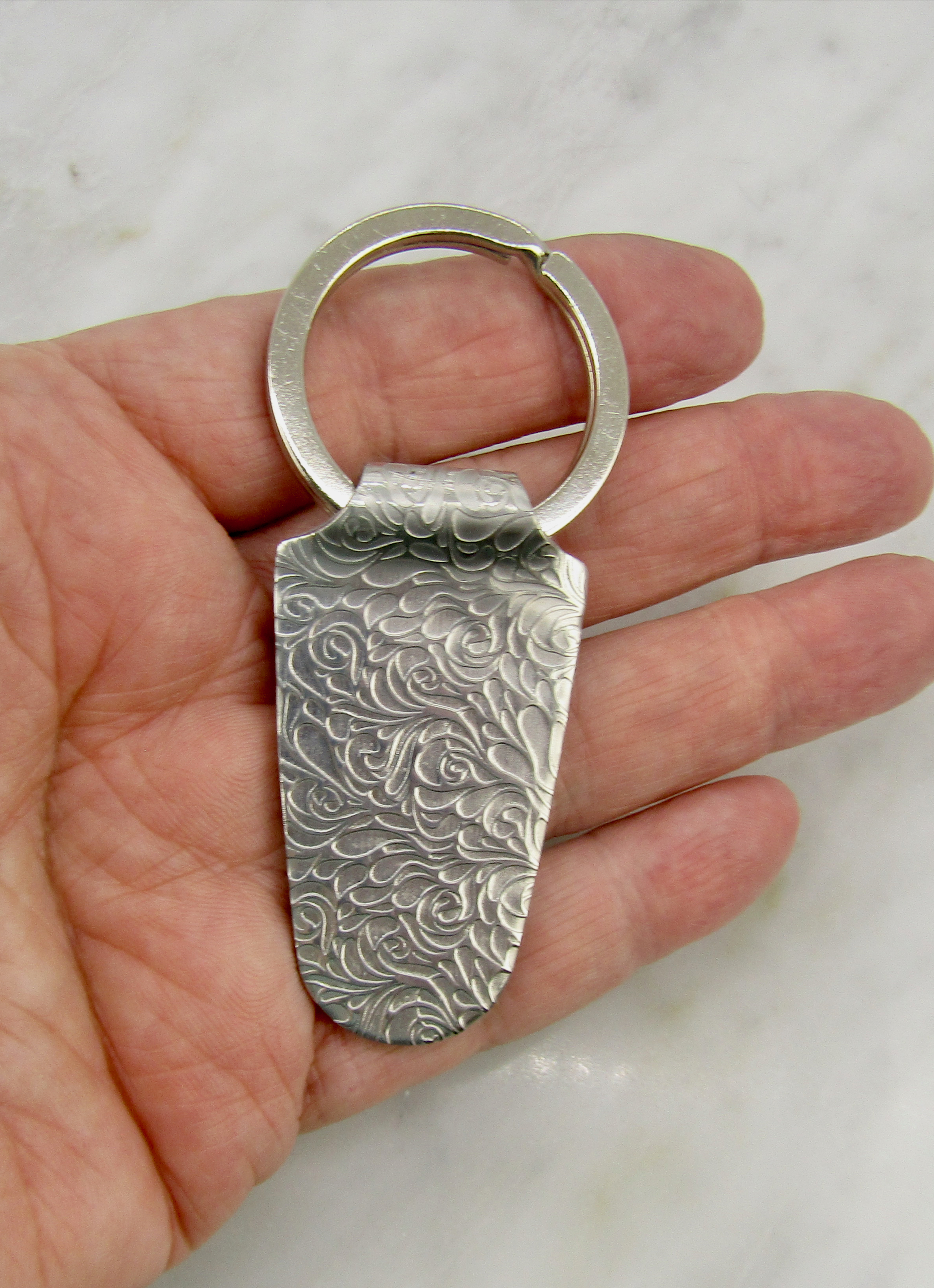 Beautifully textured lead-free, pewter keychain with a stainless steel ring. From top to bottom, the keychain is 3 1/4 inches long and 1 1/2 inches wide. It's a beautiful gift for birthdays, graduations, or anniversaries. The keychain will arrive gift-wrapped and ready to give. Pewter is very slow to tarnish and can be cleaned with the polishing cloth.
