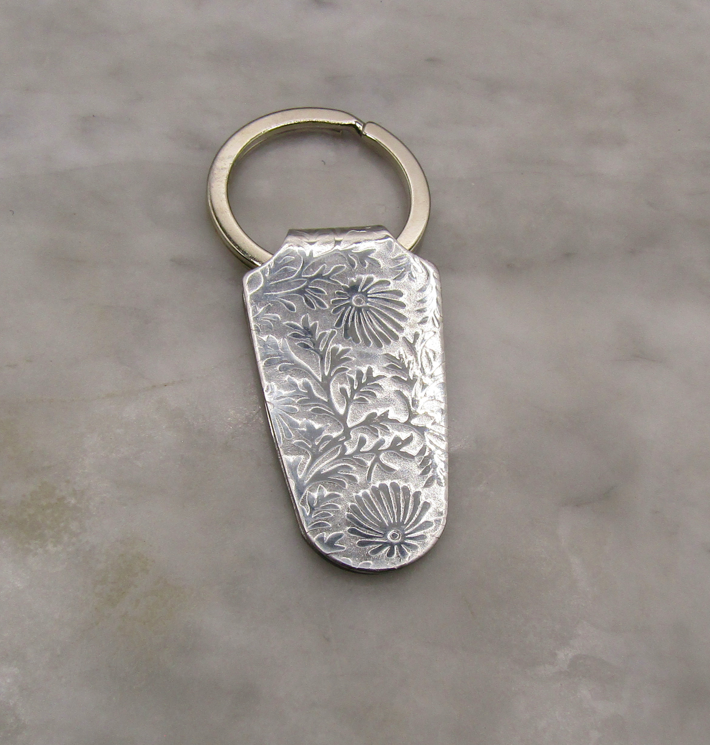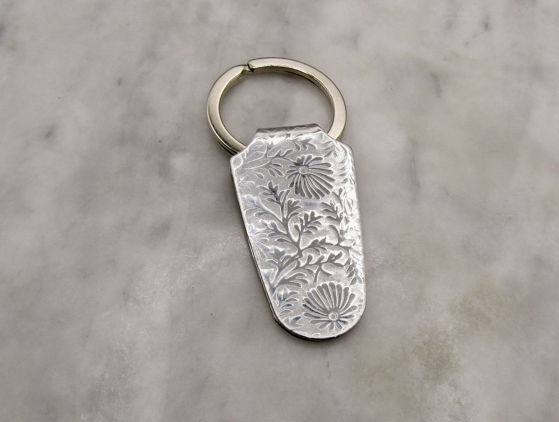 Beautifully textured lead-free, pewter keychain with a stainless steel ring. From top to bottom, the keychain is 3 1/4 inches long and 1 1/2 inches wide. It's a beautiful gift for birthdays, graduations, or anniversaries. The keychain will arrive gift-wrapped and ready to give. Pewter is very slow to tarnish and can be cleaned with the polishing cloth.