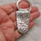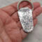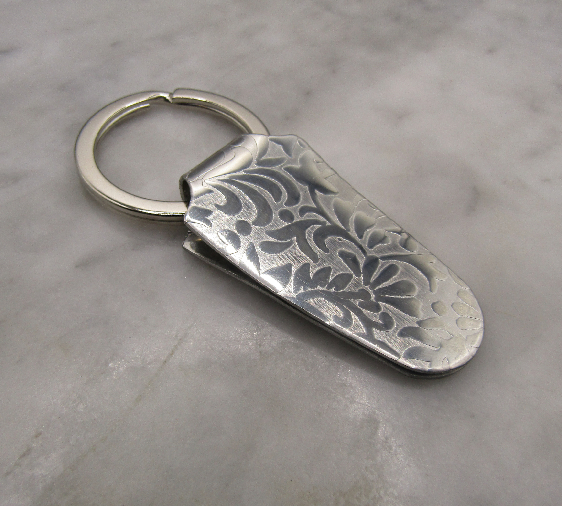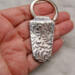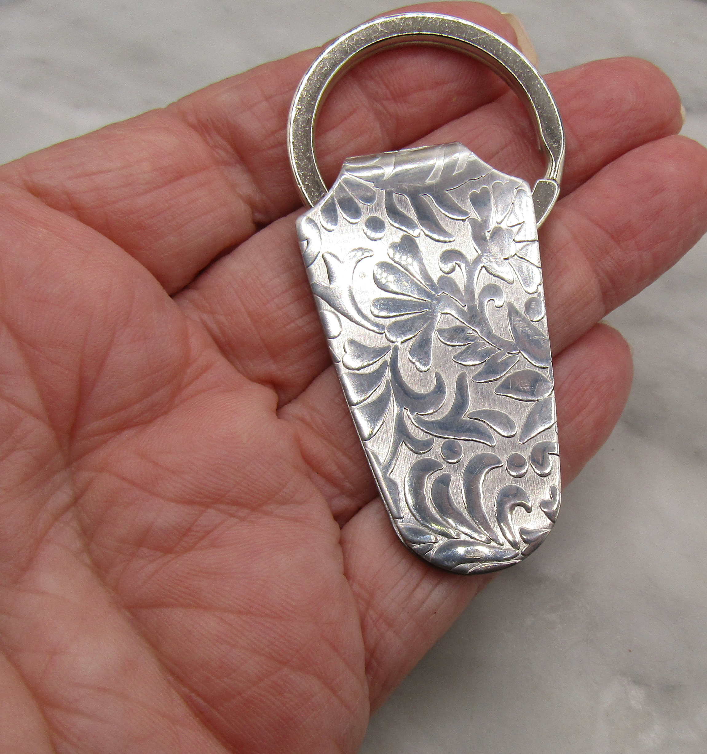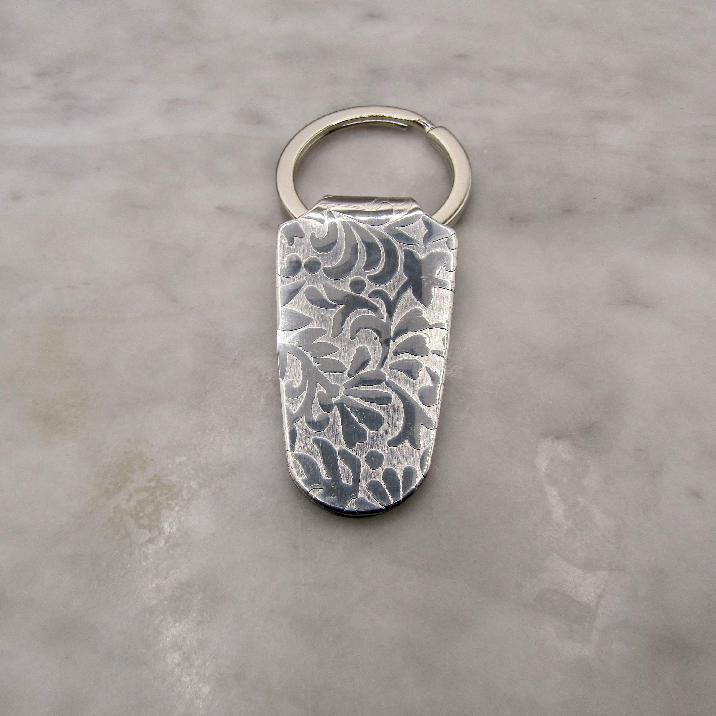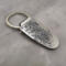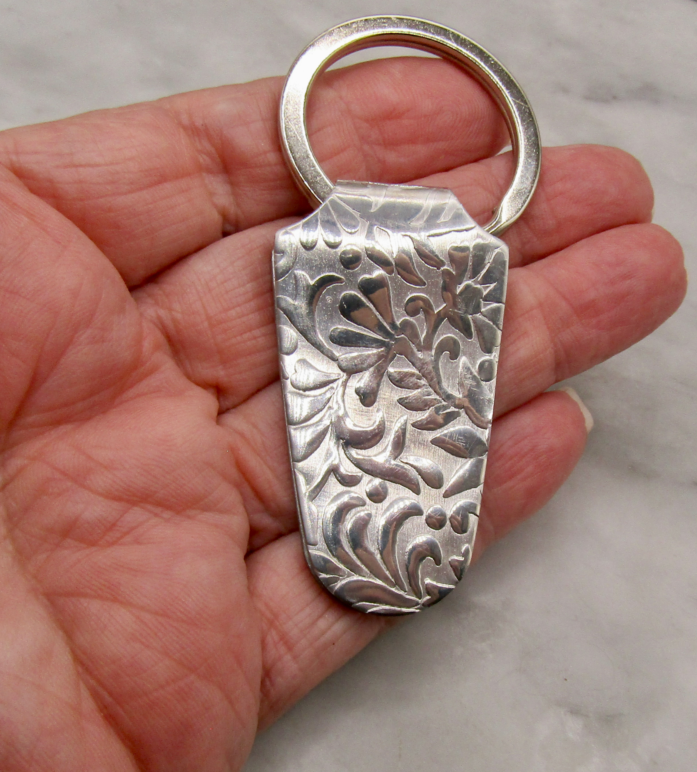 Beautifully textured lead-free, pewter keychain with a stainless steel ring. From top to bottom, the keychain is 3 1/4 inches long and 1 1/2 inches wide. It's a beautiful gift for birthdays, graduations, or anniversaries. The keychain will arrive gift-wrapped and ready to give. Pewter is very slow to tarnish and can be cleaned with the polishing cloth.