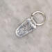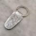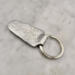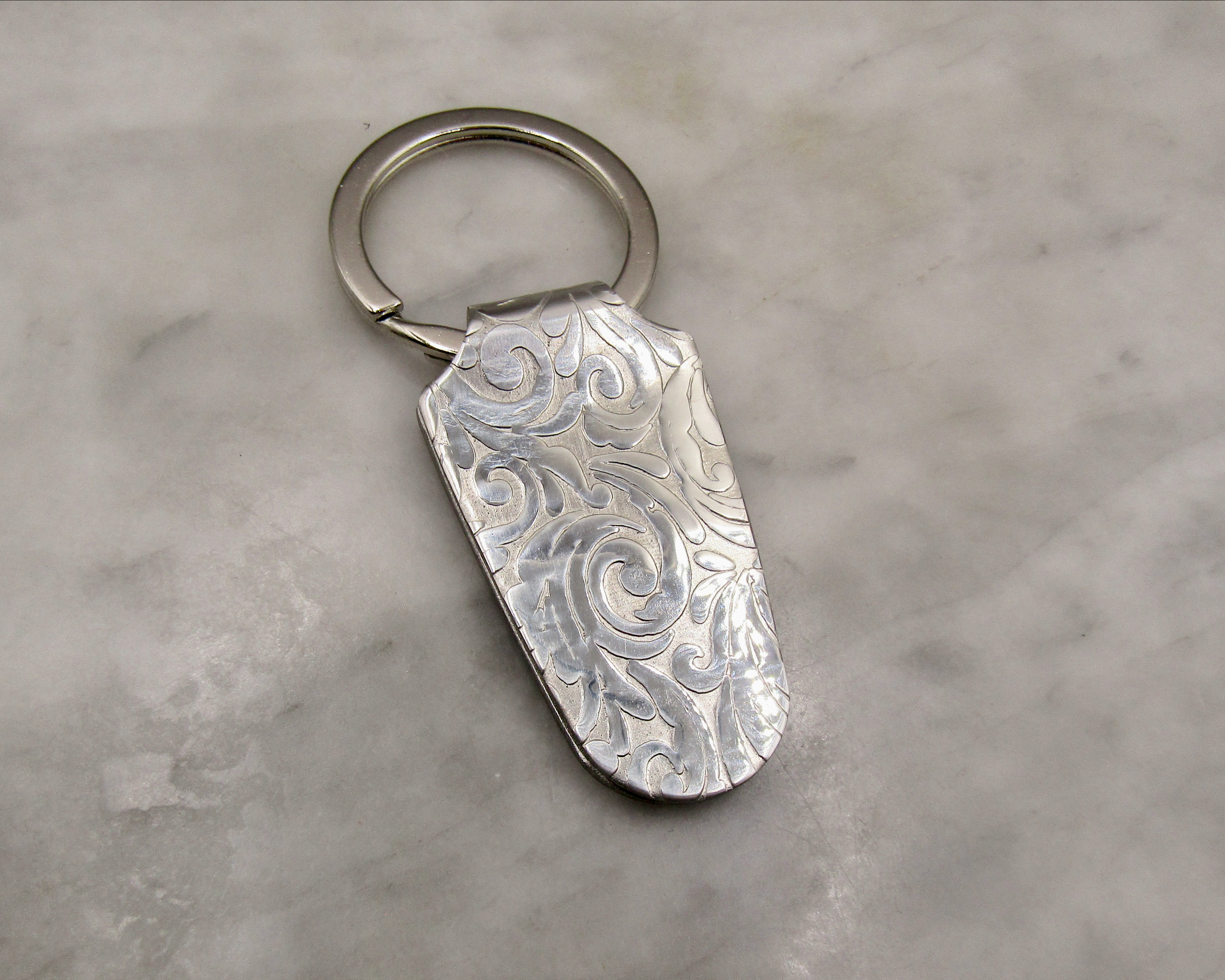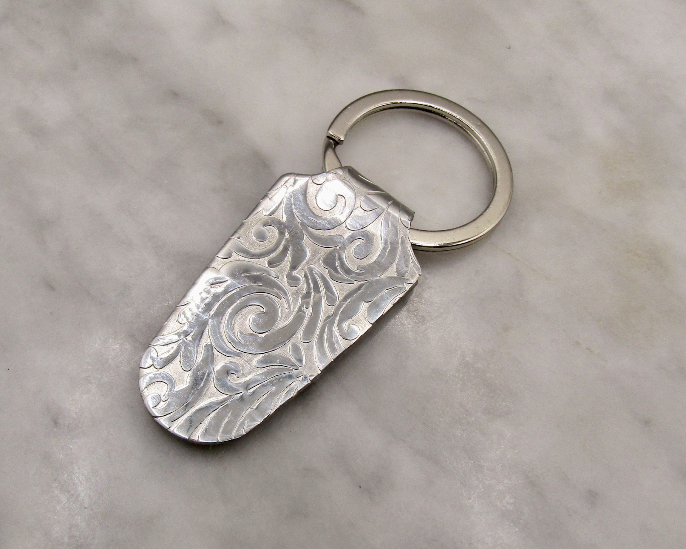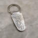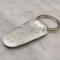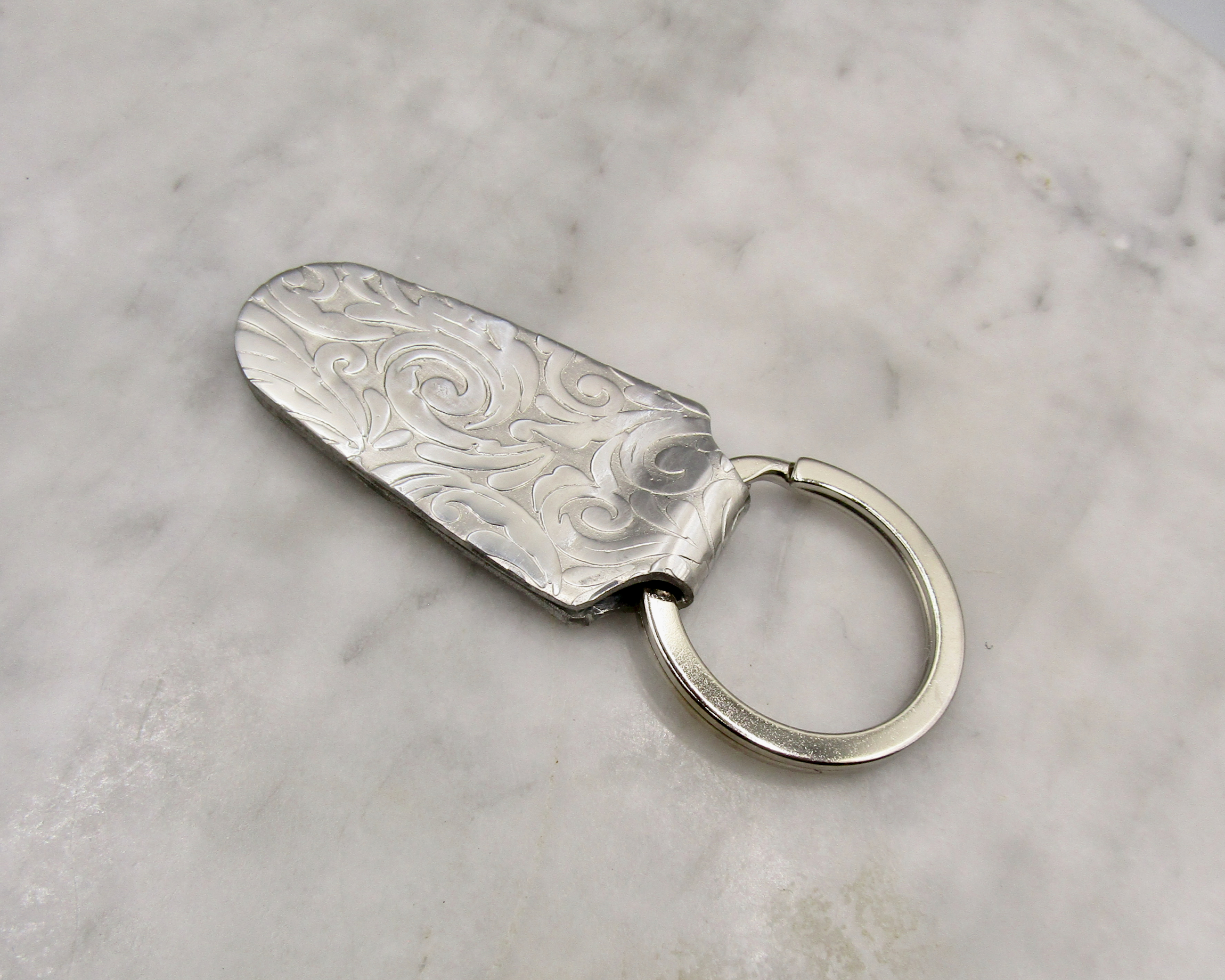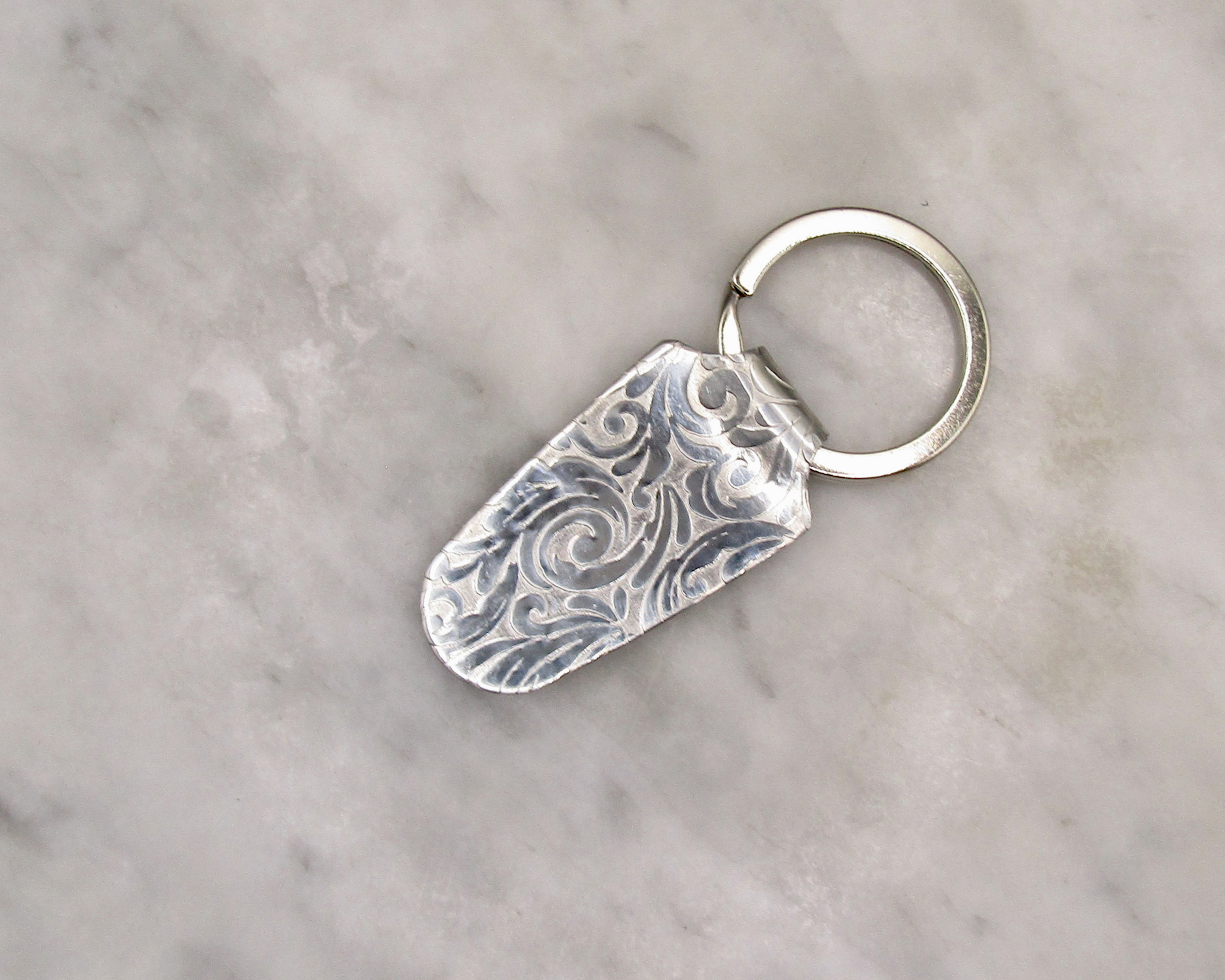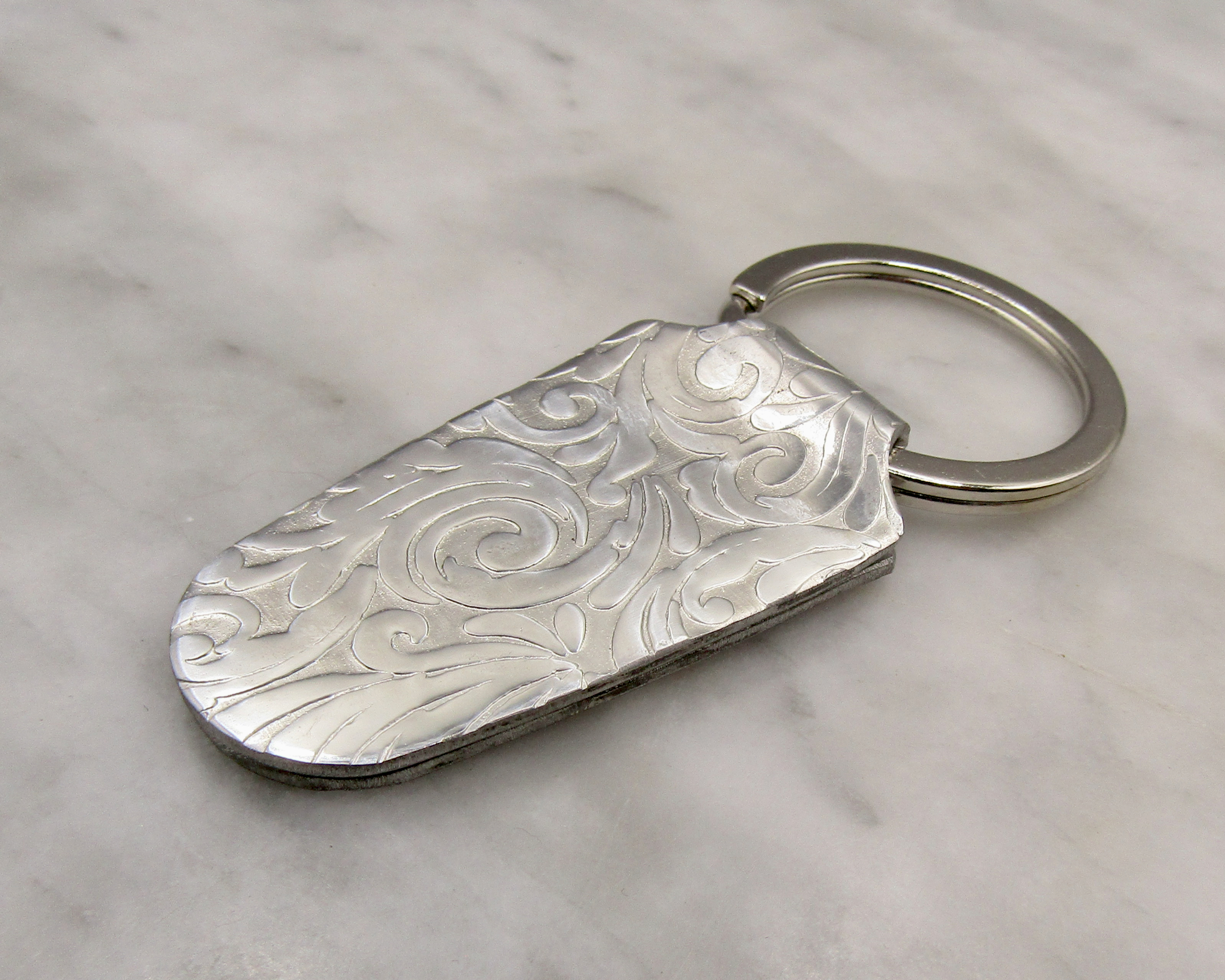 Beautifully textured lead-free, pewter keychain with a stainless steel ring. From top to bottom, the keychain is 3 1/4 inches long and 1 1/2 inches wide. It's a beautiful gift for birthdays, graduations, or anniversaries. The keychain will arrive gift-wrapped and ready to give. Pewter is very slow to tarnish and can be cleaned with the polishing cloth.