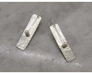 Long Pearl Drop Earrings, Hammered Rectangular Sterling Silve...